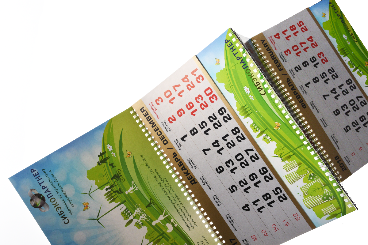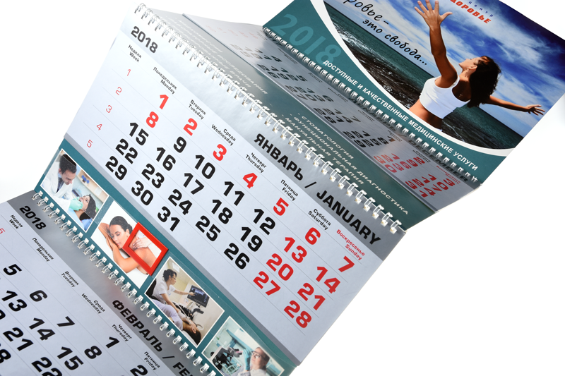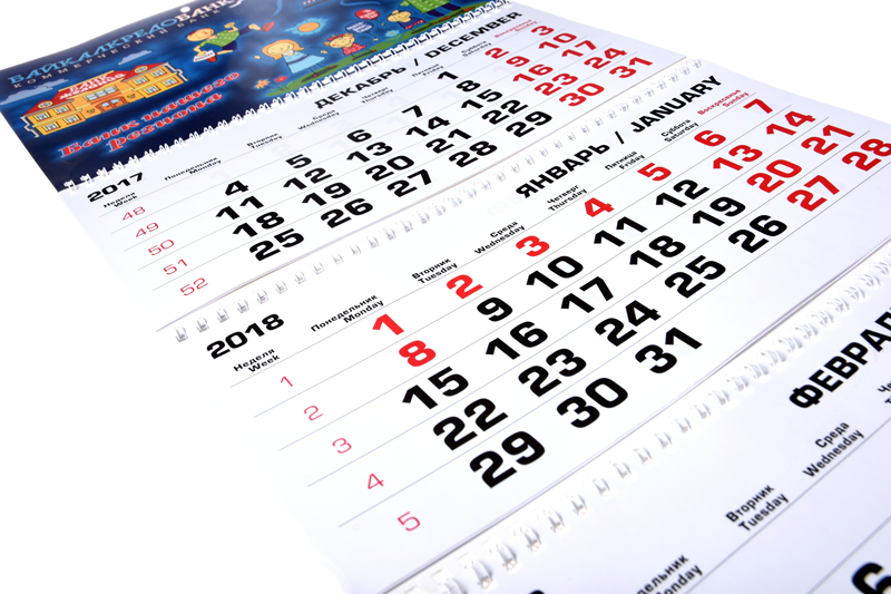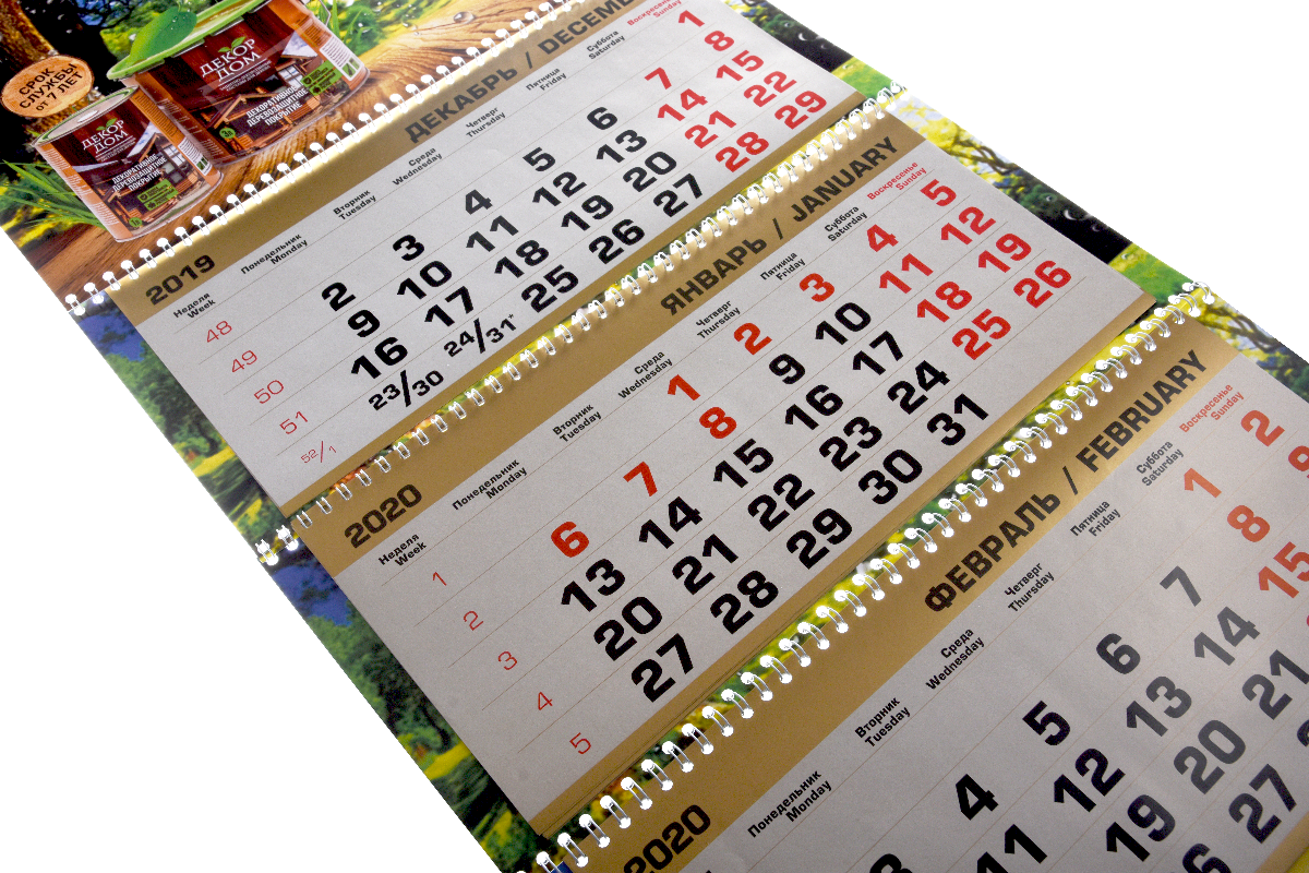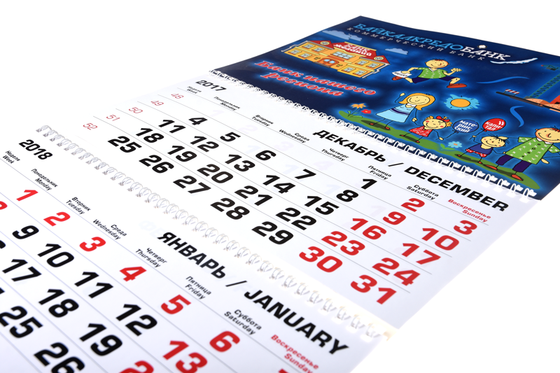 По конструкции трехблочный календарь состоит из постера (верхняя часть), календарных блоков (сетки) и подложки. Если подложку делать больше, чем календарная сетка, то видны рекламные поля (один или три в зависимости от желания заказчика).
