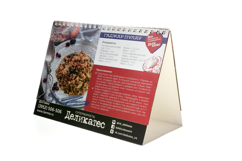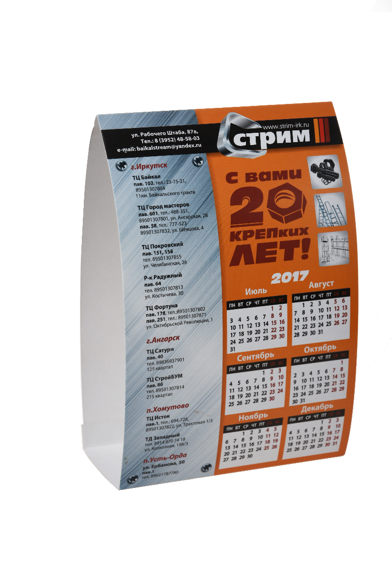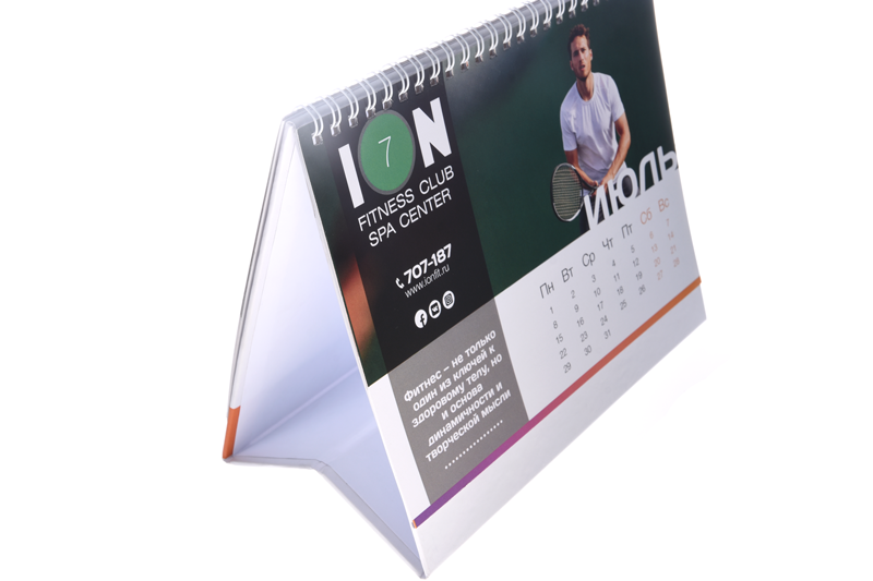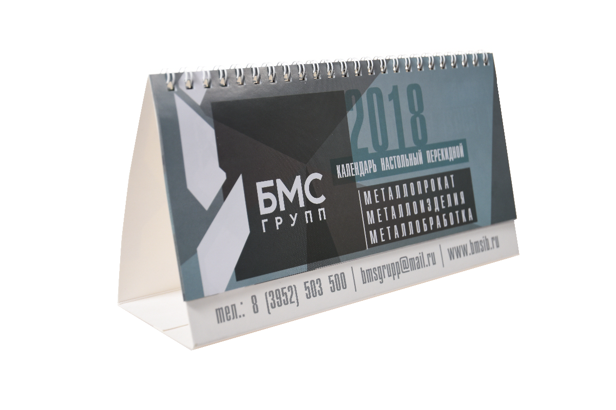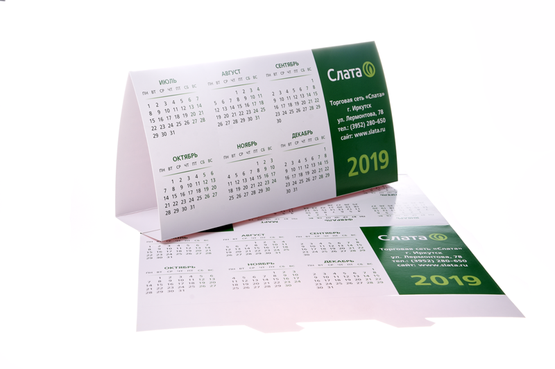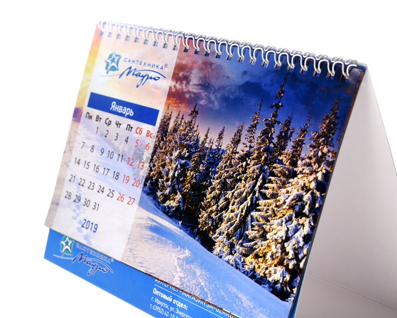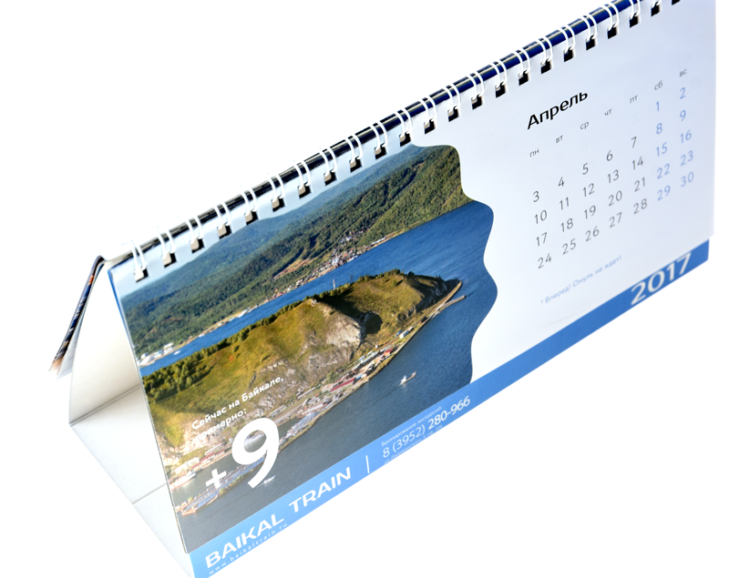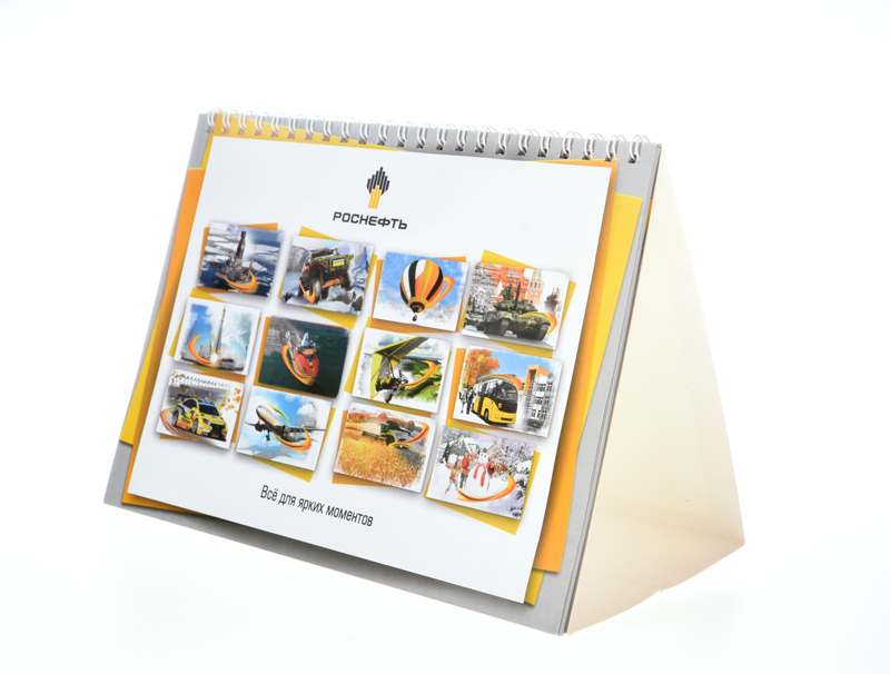 Перекидные настольные календари могут иметь до 13 страниц и скрепляться пружинкой. Кроме того, на настольных календарях можно разместить более подробную информацию о деятельности и продукции компании либо добавить поля для необходимых заметок.